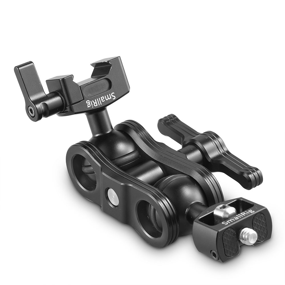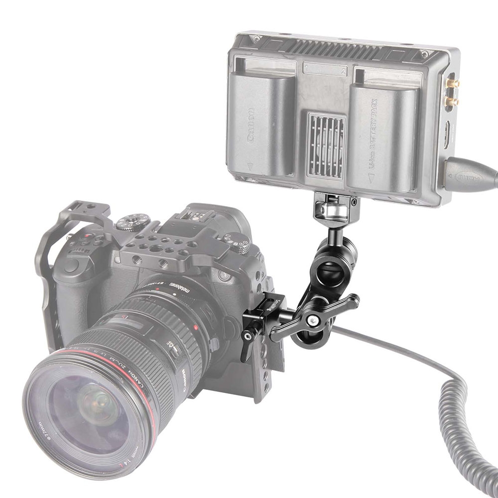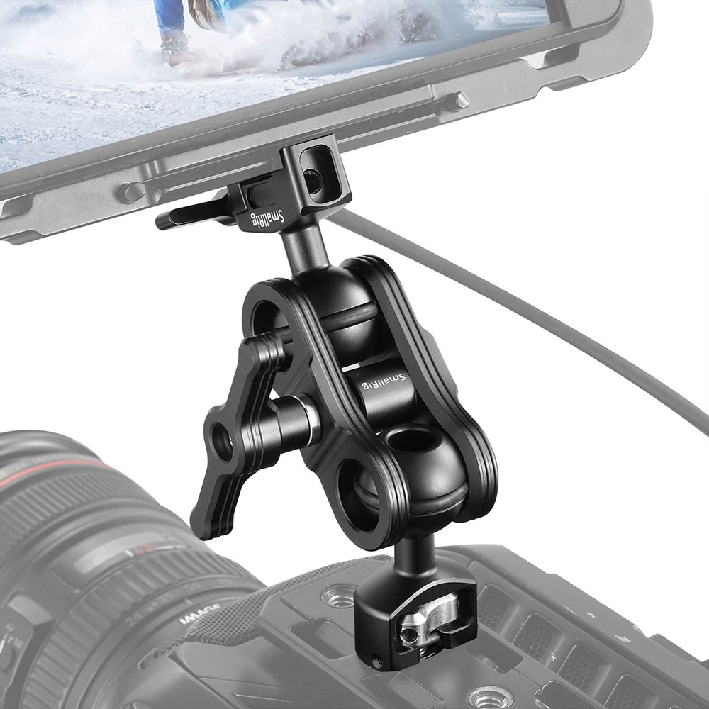 SmallRig Articulating Arm 2071 includes a ballhead with 1/4" screw, a ballhead with NATO clamp and a ballhead clamp. It enables additional attachment for your options as per your needs and different shooting scenarios. For example, it could attach plate with 1/4"-20 threaded holes or cage with 1/4"-20 threaded holes on the one end via ballhead with 1/4" screw, while it could also attach monitor cage with NATO rail with on the other end via ballhead with NATO clamp. It could attach cage with NATO rail with on the other end via ballhead with NATO clamp, while it could attach monitor cage on the other end via ballhead with 1/4" screw. It features a thumb screw on each end to lock the device manually. The monitor mounted on it could be adjusted in different positions and angles via both the ballhead and ballhead clamp, and a single wingnut is applied to lock the double ballhead tight directly. It is equipped with O rings to increase the friction with the ballhead clamp and prevent scratches and rubber cushions to prevent the monitor from scratches.
