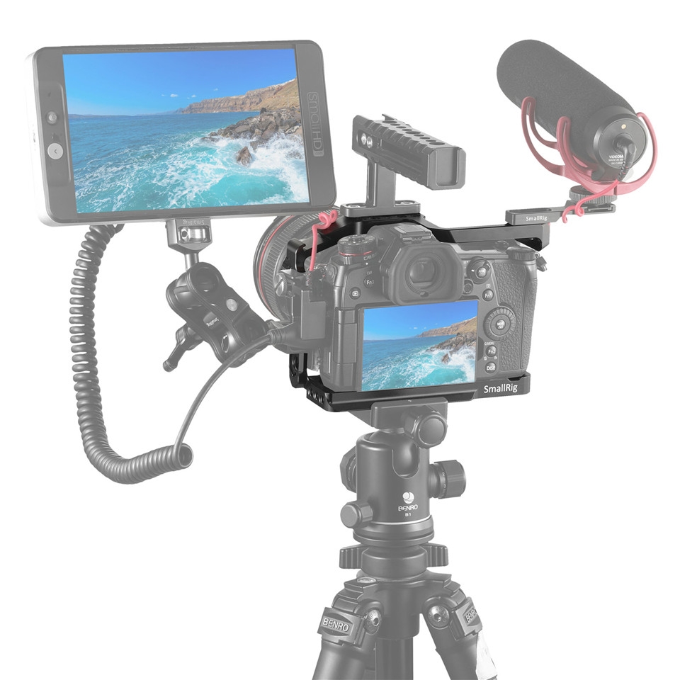 SmallRig Cage for Panasonic Lumix DC-G9 Camera 2125B is designed to provide protection and accessory mounts. The cage secures to the bottom of the camera via one 1/4”-20 screw and adopts a raised edge on the front to prevent twisting. Featuring integrated NATO rails on both sides allow for mounting Magic Arm 2071 and Wooden Handle 2187. There are multiple 1/4”-20 and ARRI 3/8”-16 accessory mounts on the cage for attaching accessories like Top Handle 2165 and Monitor Mount 2904. The top of the cage has a built-in cold shoe mount for attaching microphones and light. The bottom integrates an Arca-type plate that enables mounting on a tripod head. A flat head screwdriver is included to secure the camera screw and stores on the bottom of the cage. Optional Baseplate 2092 is separately available for 15mm LWS rod system. Moreover, HDMI Cable Clamp 1822 can be attached to the side of the cage to protect the HDMI port.