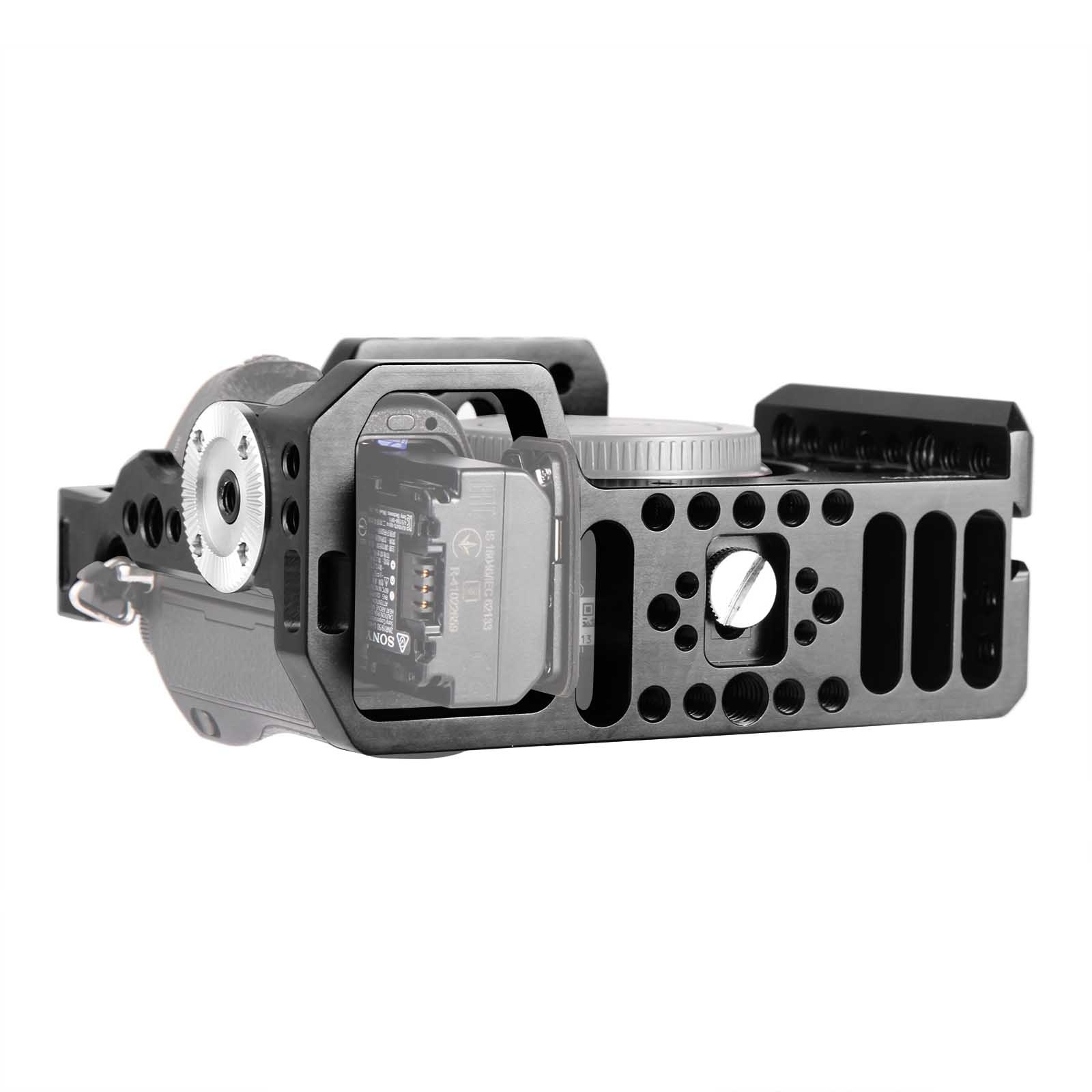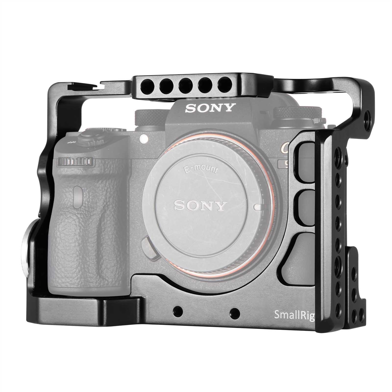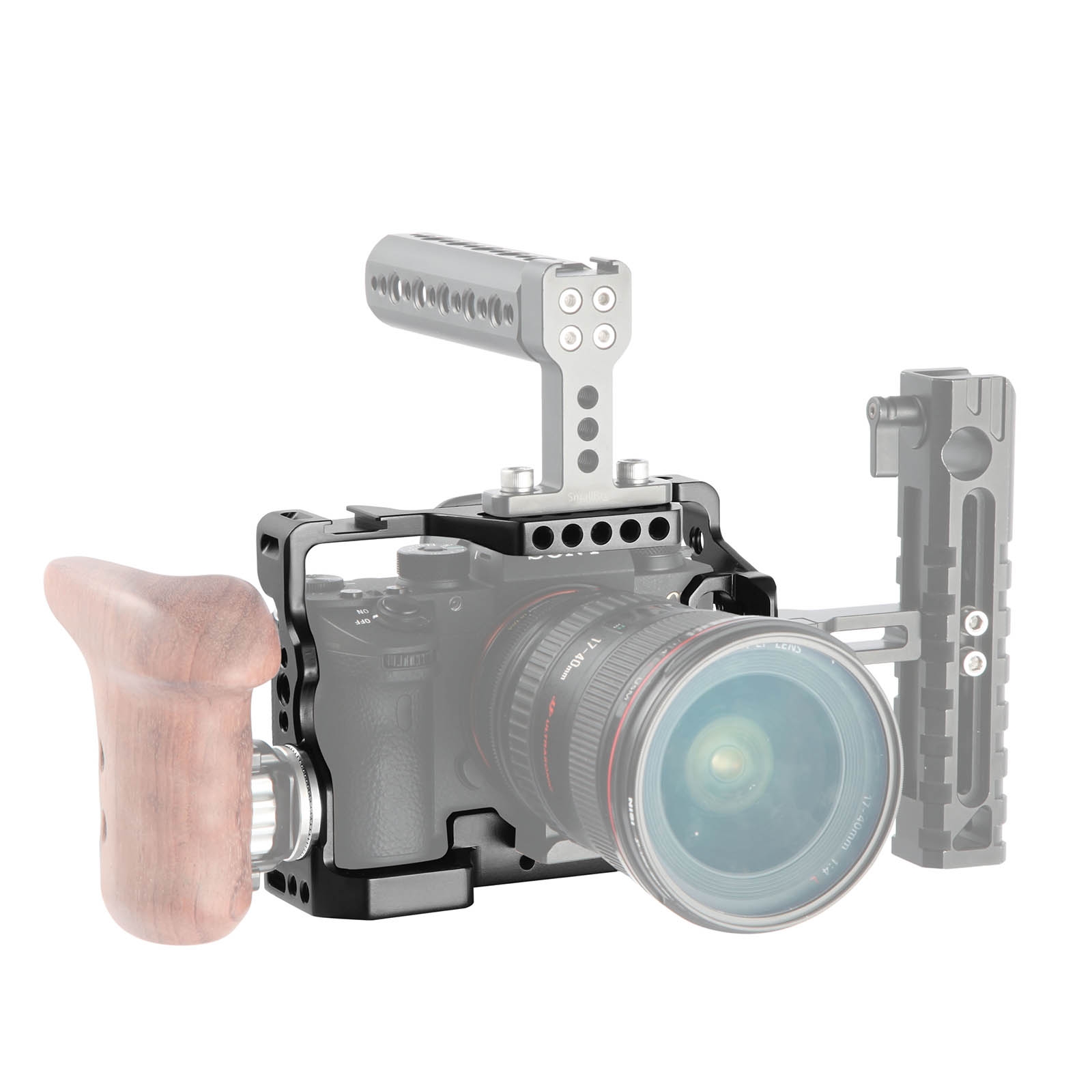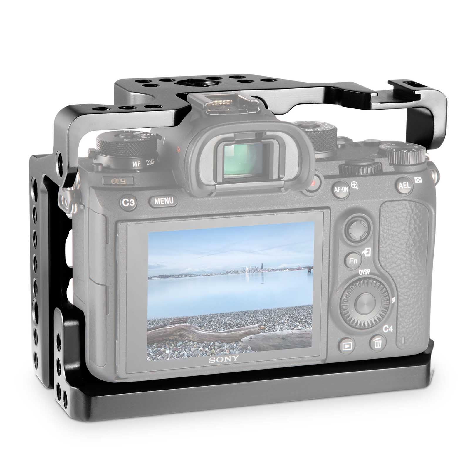 SmallRig cage 2013 is exclusively designed for Sony A9.The cage is equipped with an eyelet for the wrist strap on the top, which is very beneficial for handheld shooting and prevents the kit from accidental dropping. The integrated cold shoe could attach Multi-Functional Ball Head 1875 or Multi-function Double BallHead 1135 for monitor or wireless video transmitter. M4 threaded holes in the front could attach Lens Adapter Support 1764, which provide great protection for the long and heavy lens mount. NATO rail on the left side could be utilized to attach QR Cheese Handle 1688 for handheld shooting, or it could mount EVF Mount with Nato clamp 1897 for monitor. Arri locating points could be used to attach Magic Arm 2026 for monitor or wireless video transmitter. Arri rosette on the right could attach Wooden Grip 1941 for better handheld shooting experience. The anti-twist design in the front of cage ensures the camera is placed in the right position and supports the shooting. Four M4 threaded holes at the bottom could mount Arca Swiss Quick Release Plate 1710 for 15mm Rail Support System Baseplate (Arca Swiss) 1687. The cage is equipped with an abundance of 1/4" and 3/8" threaded holes for more accessories. In addition, the cage is so well designed that it does not block the camera's buttons, ports and battery compartment etc.