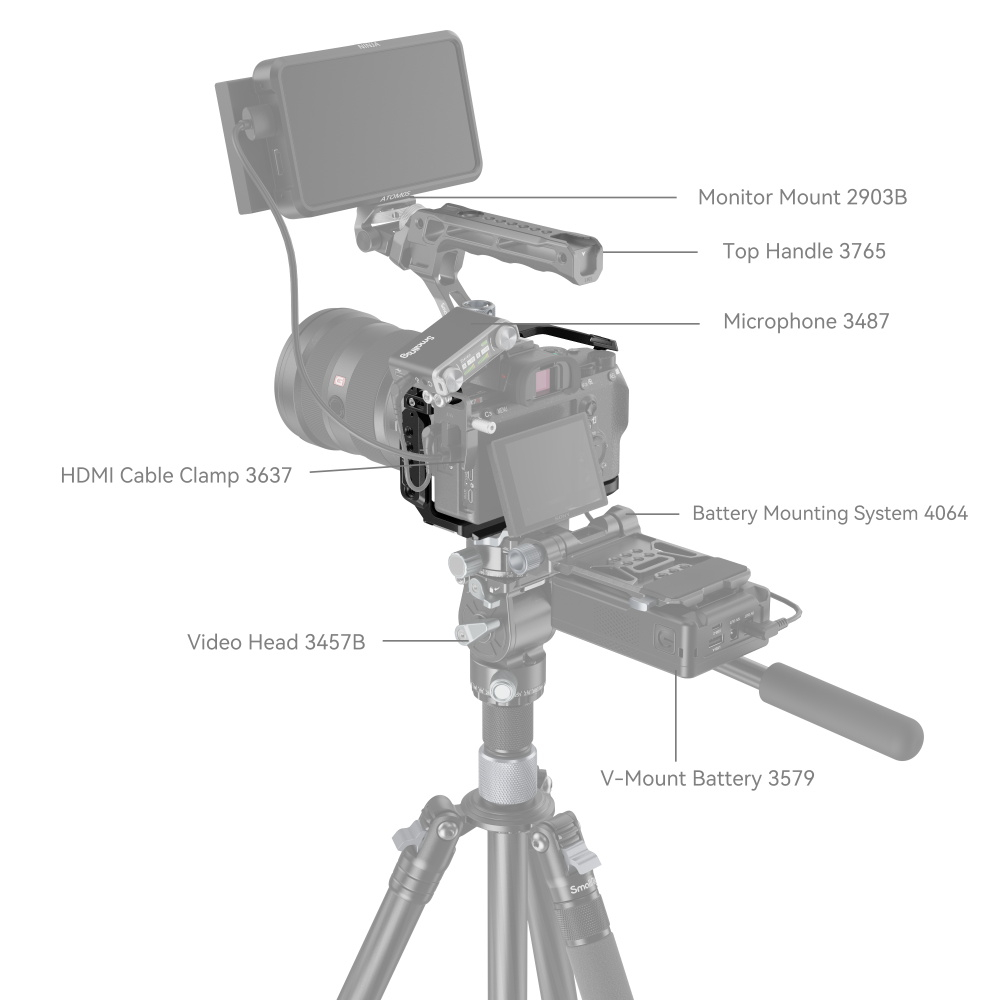 SmallRig Cage for Sony Alpha 7 III / Alpha 7R III 2087D is designed to provide accessory mounts and protect the camera. It locks the camera via one 1/4"-20 screw and two M2.5 screws on both sides. Built-in all-around protective spacers prevent the camera from being scratched. The cage gives access to interfaces, dials, buttons, or battery doors. There is a hinged arm at the battery compartment which fits the camera curve and leave room for little fingers for a comfortable grip. 1/4"-20 threaded holes, ARRI 3/8" -16 locating holes and cold shoe mounts support top handle 3765, side handle 3260, monitor mount 2903B, microphones, LED lights, monitors, etc. The bottom QD socket supports the QD shoulder strap. Arca-Swiss quick-release plate at the bottom is compatible with DJI RS 2 / RSC 2 / RS 3 / RS 3 Pro, the quick-release plate (riser plate) of DJI RS 2/RSC 2 stabilizers for stabilizer shooting, and the Arca-Swiss quick release plate 3154. Optional HDMI Cable Clamp 3637 / 1679 to protect interfaces and ensure stable signal transmission during filming. Holes on the cage's sides and bottom allow attaching accessories such as hand strap PAC2456 and shoulder strap PSC2428. Besides, the cage comes with a built-in magnetic spanner that facilitates disassembly and assembly.