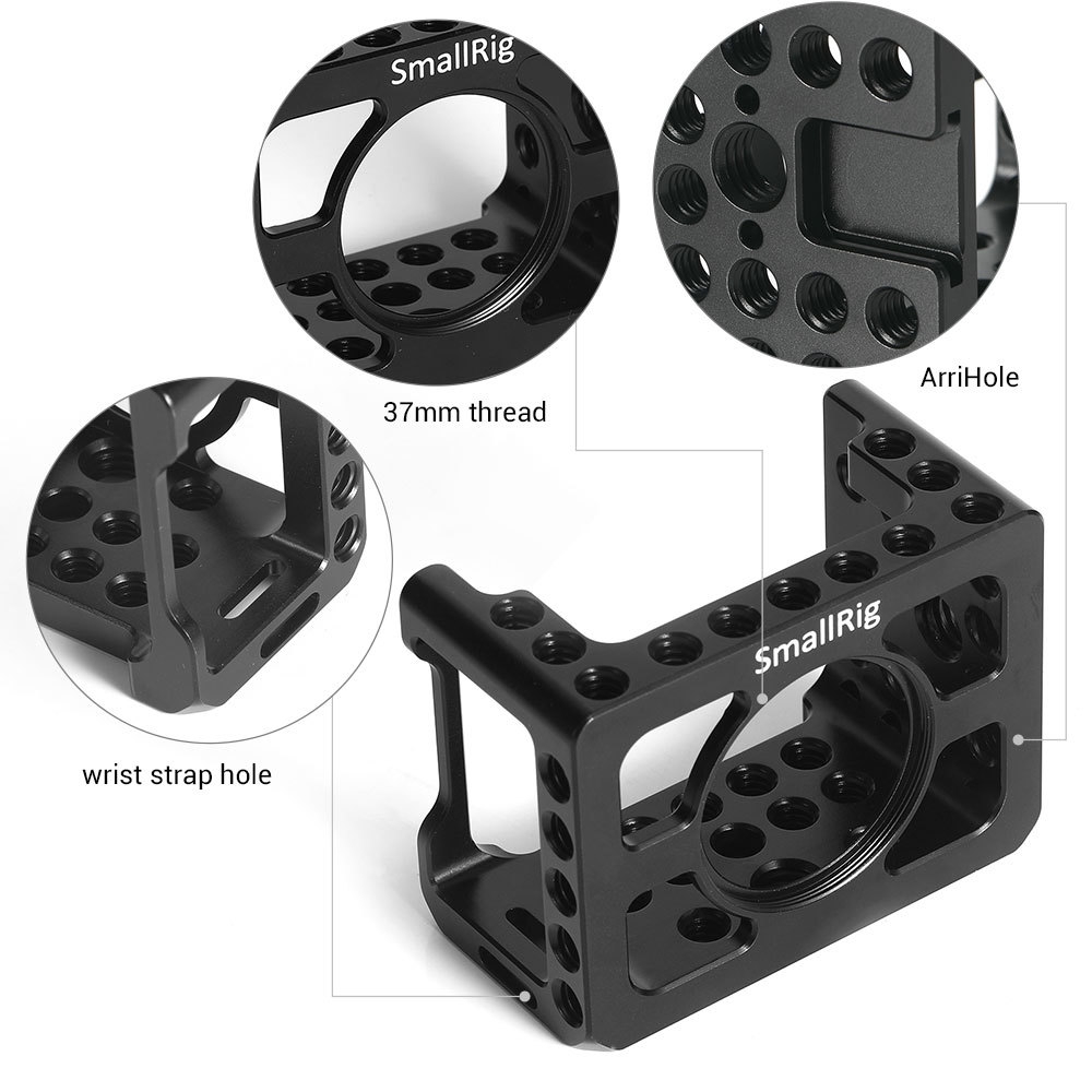 SmallRig Cage for Sony RX0 II Camera CVS2344 is designed to provide protection and mounting solutions for Sony RX0 II. The cage is fixed on the camera via the bottom 1/4"-20 threaded hole and will not obstruct the tilt LCD screen when use the self-timer mode. It comes with multiple 1/4"-20 and arri locating holes for accessory attachment, such as Magic Arm 2070 for monitor and Cold Shoe 2260 for microphone. The cage also provides an integrate cold shoe on the left side for microphone and features a strap hole on the right side for camera strap. Besides, the 37mm thread in front allows to mount filters and wide angle lens of 37mm diameter. Optional Top Handle 1984 are provided if you want to hold the camera for low profile shooting.