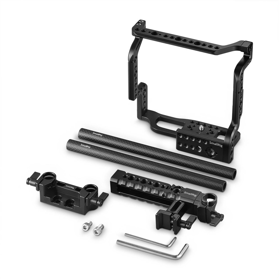 This kit is specially designed for Fujifilm X-H1 camera with battery grip, it includes the cage 2124, nato top handle 2027, dual rod clamp 1943 and two 15mm rods 1690 to provides a comfort handheld shooting. It features 15mm rods system on the bottom to ensure the 85mm distance from rods' center to the lens' center for lens support, follow focus and mattebox. There are rows of 1/4, 3/8 and arri 3/8 holes for mounting accessories.
