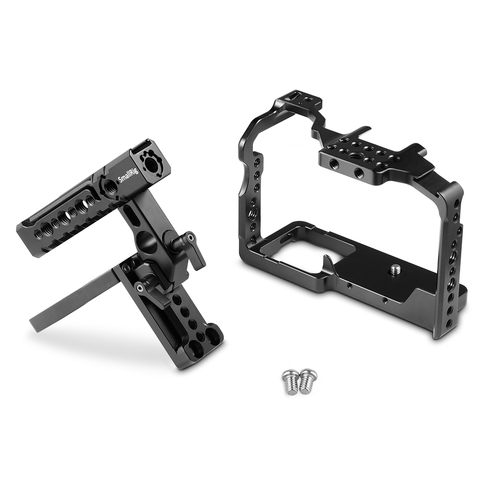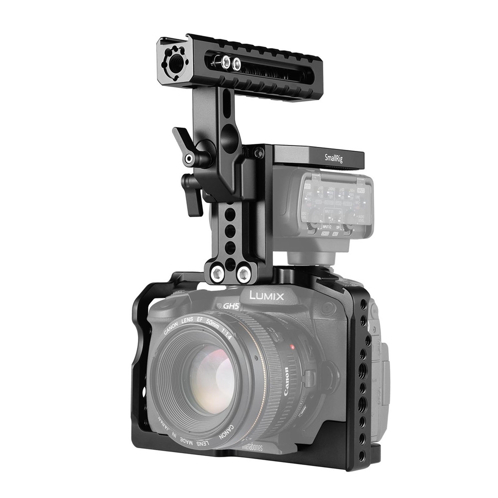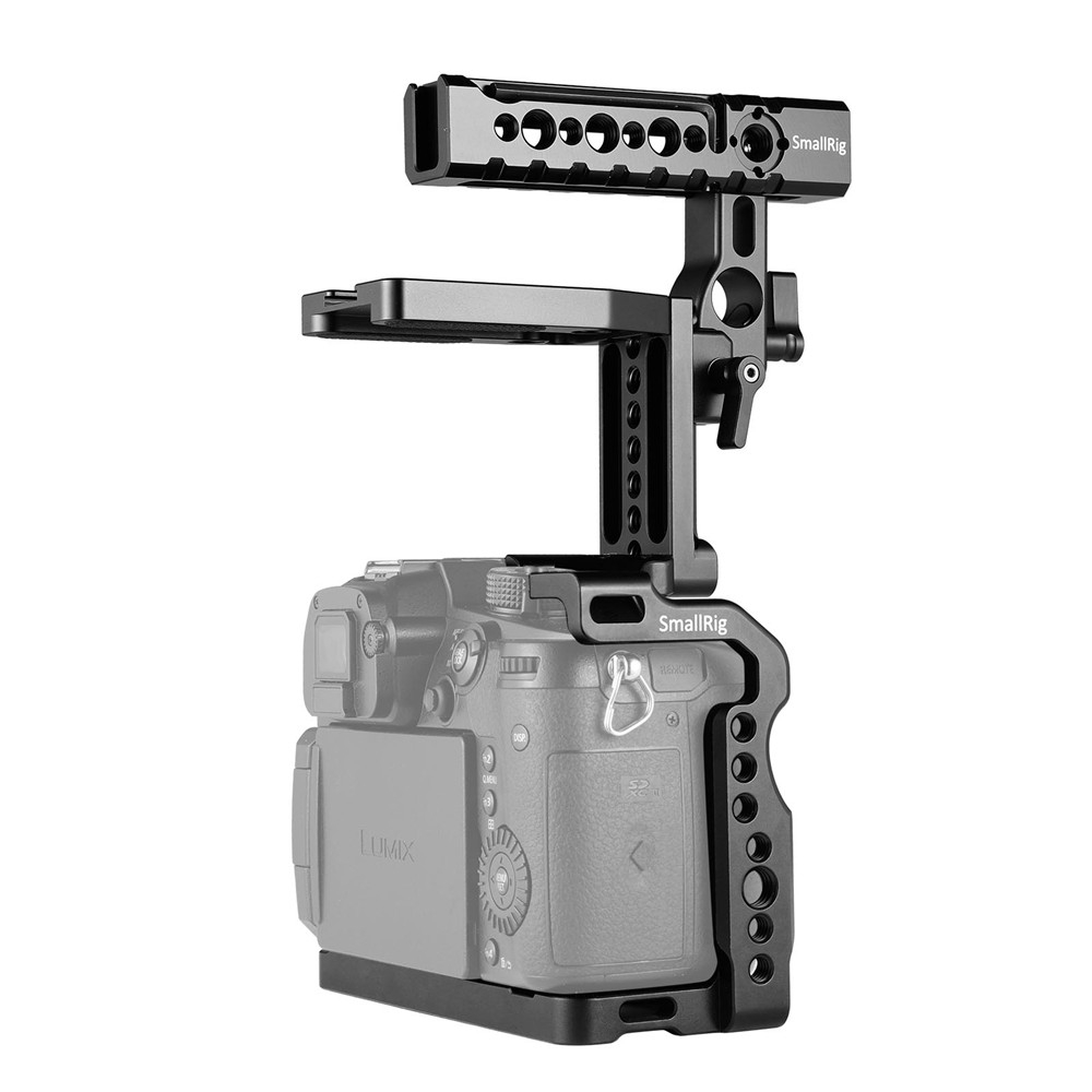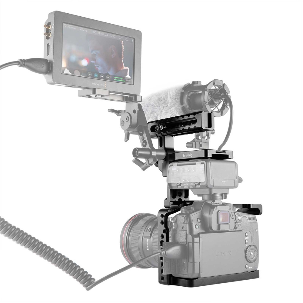 SmallRig Cage with Helmet Kit 2052 includes Cage 2049 and Helmet Kit 2017. Cage 2049 attaches to Helmet Kit 2017 via two 1/4" counterbores. The handle on Helmet Kit could be adjusted up and down and forwards and backwards for balance as per your needs during shooting, and it could attach microphone, magic arm, Rod Clamp 1995 and Arri locating points e*tension etc. The top plate is utilized to provide solid protection for DMW-*LR1 microphone adapter and it is also equipped with an abundance of 1/4" and 3/8" threaded holes for DIY operations. The cage benefits your Panasonic GH5 camera in video production by strengthening protection and stability and providing more mounting options. The cage fits the camera perfectly, and it does not block any access to the SD card slot, battery compartment, and all camera controls. In addition, The cage is good for thermal dissipation of camera and prevents it from twisting.