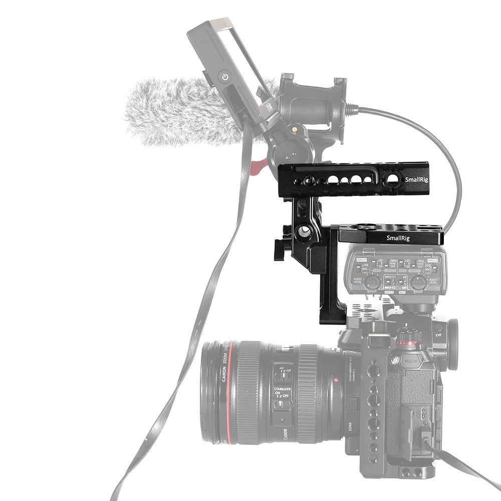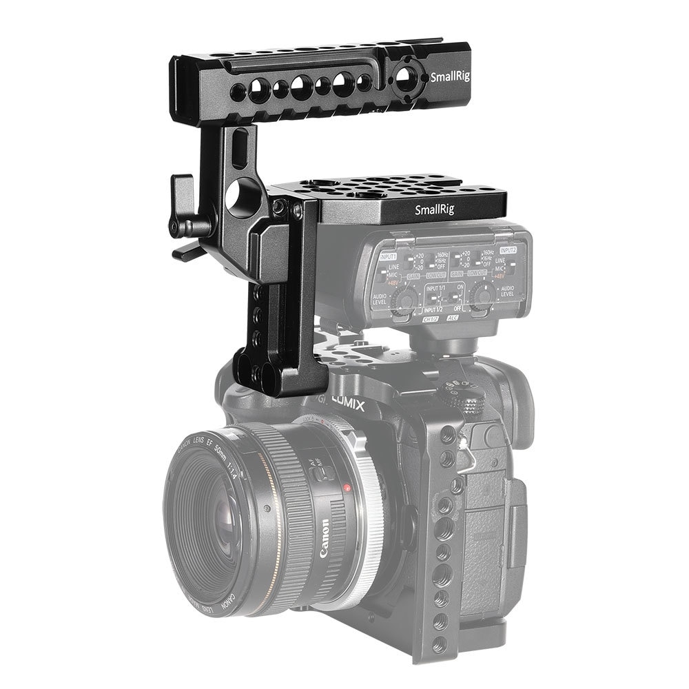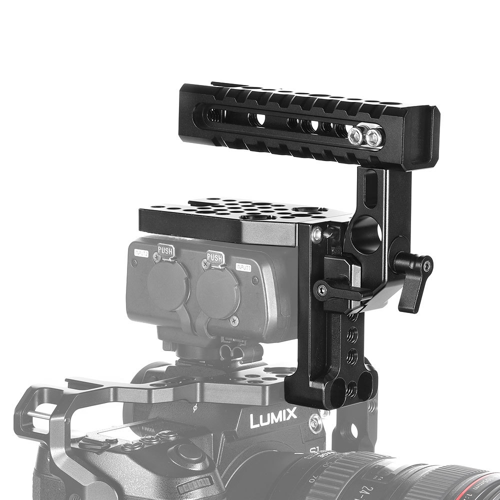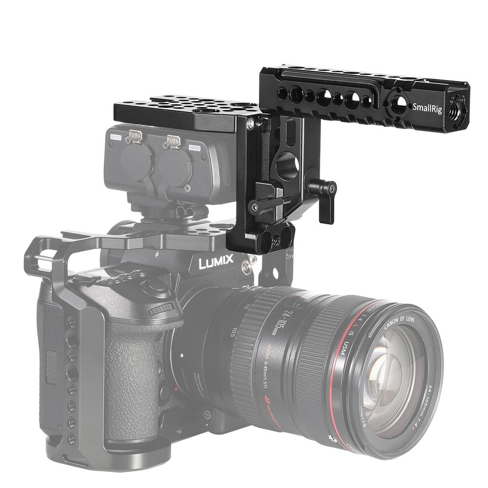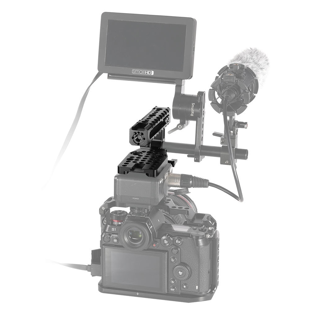 SmallRig DMW-XLR1 Helmet Kit for Panasonic S1/S1R and GH5/GH5S HTS2367 is designed to provide protection and mounting solutions for Panasonic DMW-XLR1 Microphone Adapter. The kit secures on the front of Smallrig S1/S1R Cage 2345 and GH5/GH5S Cage 2049 via two 1/4"-20 screws. It comes with multiple 1/4”-20 and arri 3/8”locating holes for accessory attachment, such as Magic Arm 2115 for monitor and Cold Shoe 2260 for microphone. The kit integrates with a cold shoe on the top for microphone and a rod clamp for 15mm rod 1587 for EVF mount. The quick release nato handle is adjustable with a range of 27.5mm.