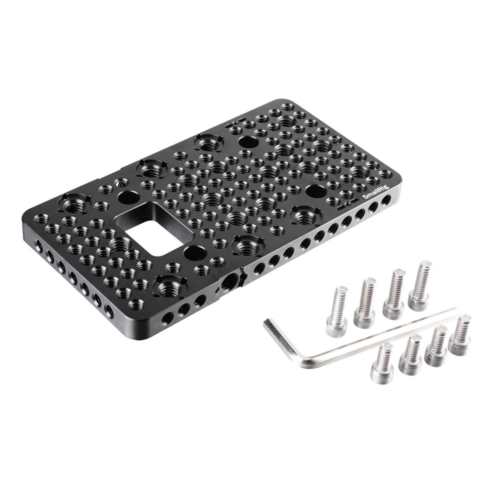 This plate is firmly mounted on top of Sony FS7/FS7II camcorders with 4 screws. The cheese shape consists of numerous 1/4" and 3/8" threaded holes, ARRI locating holes in all directions.