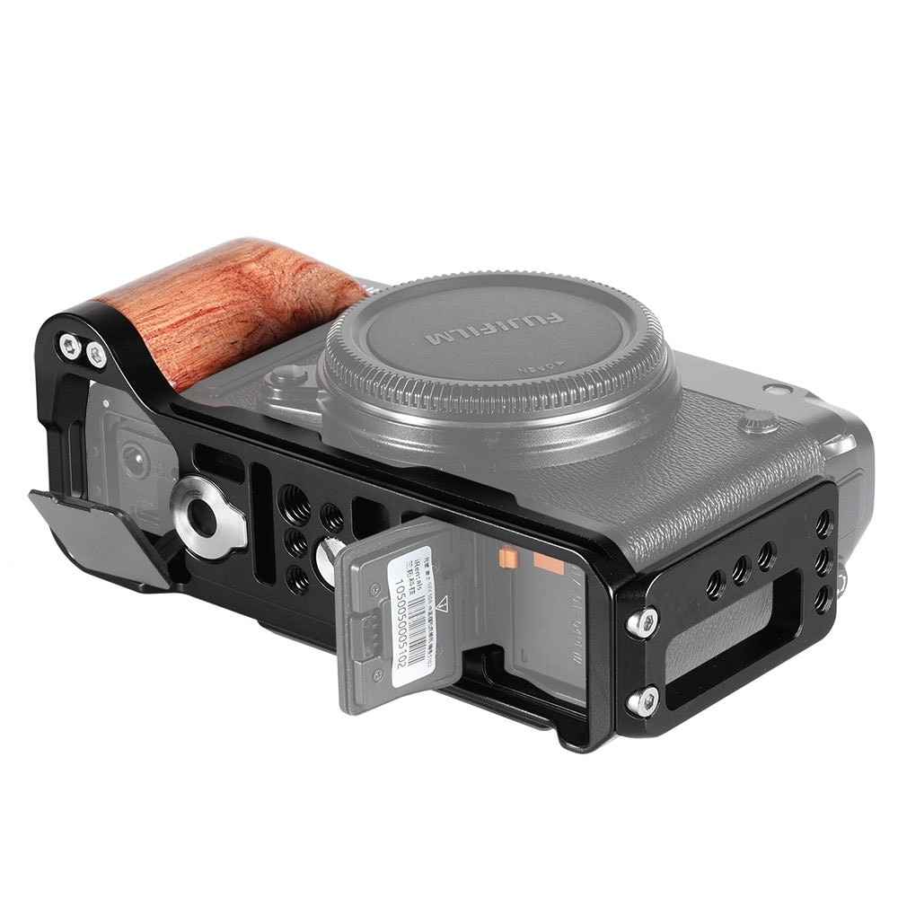 SmallRig L-Bracket for FUJIFILM GFX 50R APL2339 is modular designed with anti-twist flanges to keep the camera from twisting and provide a wooden handle for comfortable grip. It secures to the bottom of camera via a 1/4 screw. Both the base plate and side plate are Arca-type plate enable the camera to mount in a vertical or horizontal position. Each axis features a sensor centering line to align the camera on a tripod head. It comes with a wooden handgrip and add the height to support pinky. Features a flat screw driver on the bottom allows to install the L bracket in seconds. Additionally, the L plate features multiple 1/4"-20 mounting threads on the side for accessory attachment such as Cold Shoe 1593 and Side Handle 2093. The bottom comes with both 3/8