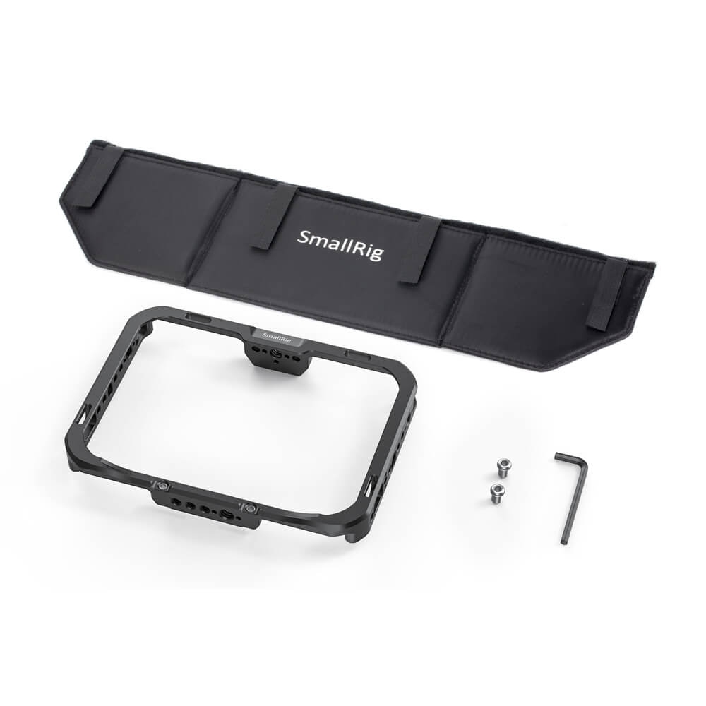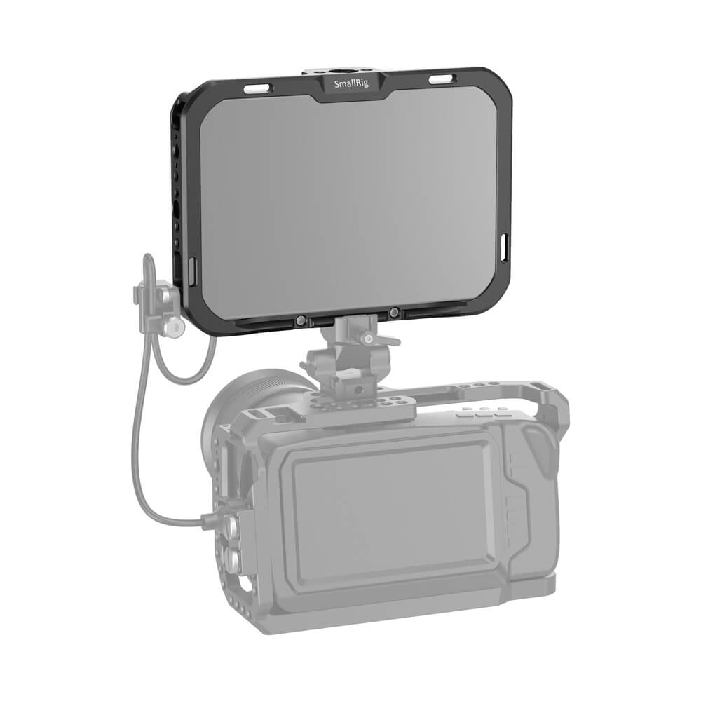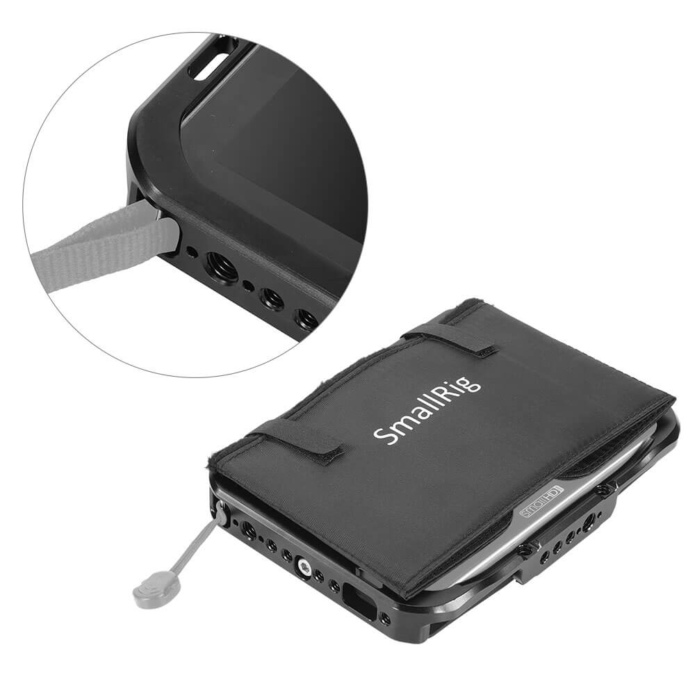 SmallRig Monitor Cage with Sun Hood for SmallHD FOCUS 7 CMS2470 is designed to provide all-around protection and accessory mounts for monitor. The cage secures to the monitor via a 1/4”-20 screw on each side to prevent twisting. Multiple 1/4’’-20 and Arri 3/8’’-16 threads are provided for accessory attachment such as Magic Arm 2070 and 2115. The bottom features a NATO rail for NATO clamp compatible accessories to quick release your setup, such as Magic Arm 2071 and Monitor Mount 2256. There are three 1/4”-20 threads on the back allows for attaching Battery Plate 1846 or Wireless Receiver Plate 2107. Dedicated sun hood are included to provide glare protection when shooting outdoor. Optional HDMI/SDI Cable Clamp BSC2333 can be used to secure the cable. The right side features a 1/4”–20 threaded hole with two locating holes allows for mounting the original SmallHD tilt arm for angle adjusting.