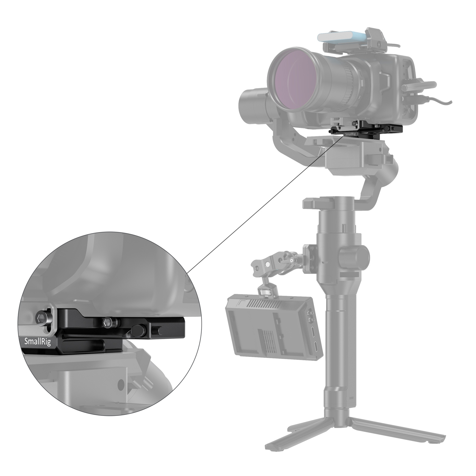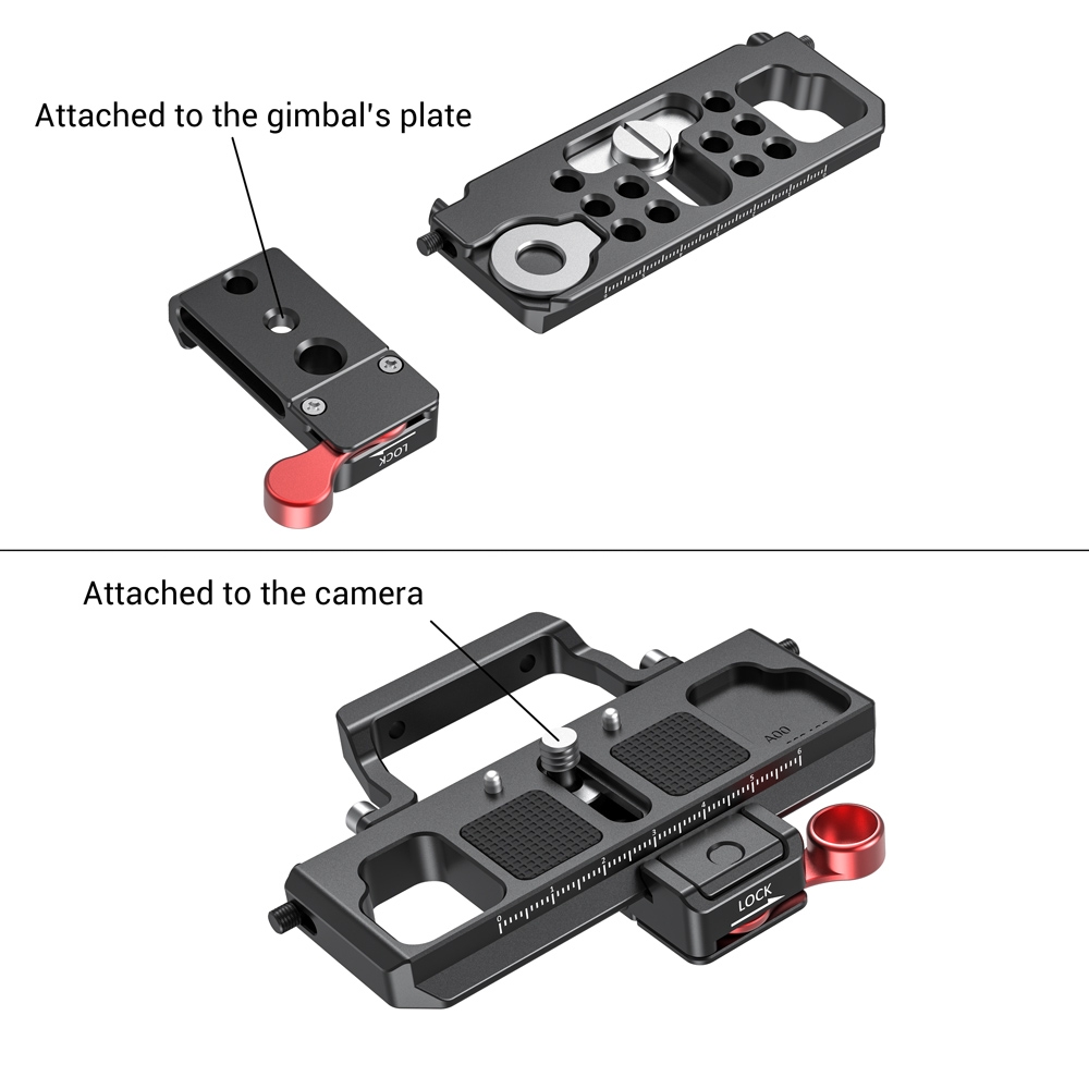 SmallRig Offset Kit for BMPCC 4K / 6K and Ronin S Crane 2 Moza Air 2 BSS2403 is designed to provide more clearance for BMPCC 4K / 6K when mounted to gimbals. The kit includes a plate and a clamp, and should be used with the original gimbal plate. Attach the plate to the camera bottom by a 1/4 screw, with anti-twist pins and rubber pads preventing wiggles and scratches; slide the clamp into the plate and fasten it by the lever; mount the whole kit to the gimbal plate. By using this kit, it’s easier to find the right position for the camera on gimbals. In addition, it comes with a detachable part that works with SmallRig Metabones Support 2247, reliefing pressure from heavy lenses. The offset kit can be applied to other cameras as well, if you prefer to adjust the camera to a better position on the gimbal.
