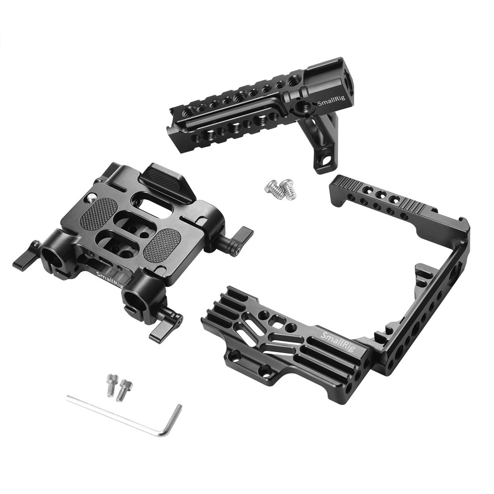 Two M4 threaded holes at the bottom of half cage are utilized to connect the cage and baseplate to ensure 85mm rod height. 15mm rod clamp could attach Black Aluminum Alloy Rod 1051 for Shoulder Pad 1485 and Battery Plate 1547. This cage that is anti-twist designed locks camera firmly and is good for heat dissipation as well. An array of 1/4" and 3/8" threaded holes at the bottom of baseplate are compatible with quick release plates of different standards.