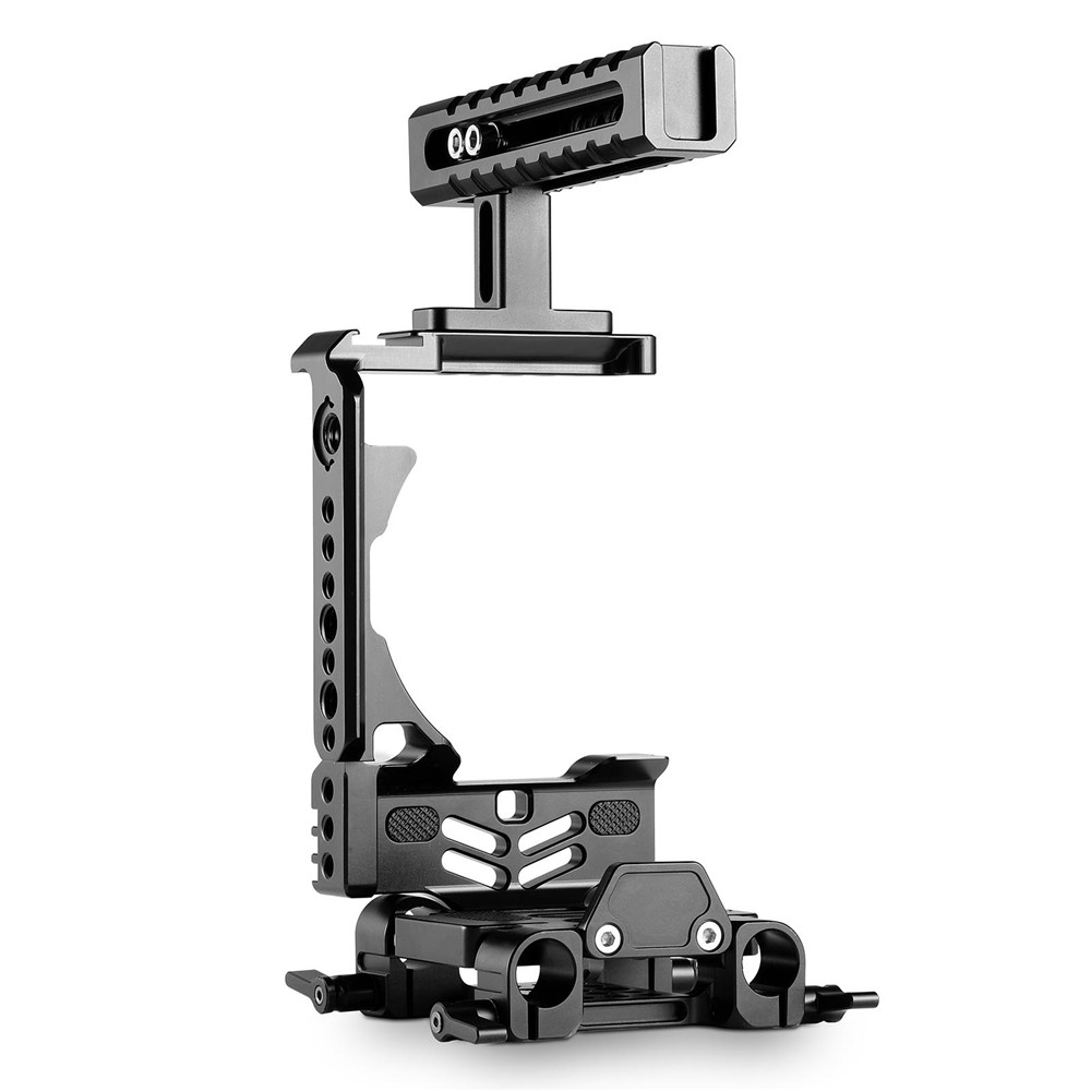 It is equipped with Top Handle 1984 on the top for handheld shooting, and the top handle comes with cold shoes, Arri 3/8" holes and an abundance of 1/4" and 3/8" threaded holes for DIY operation.