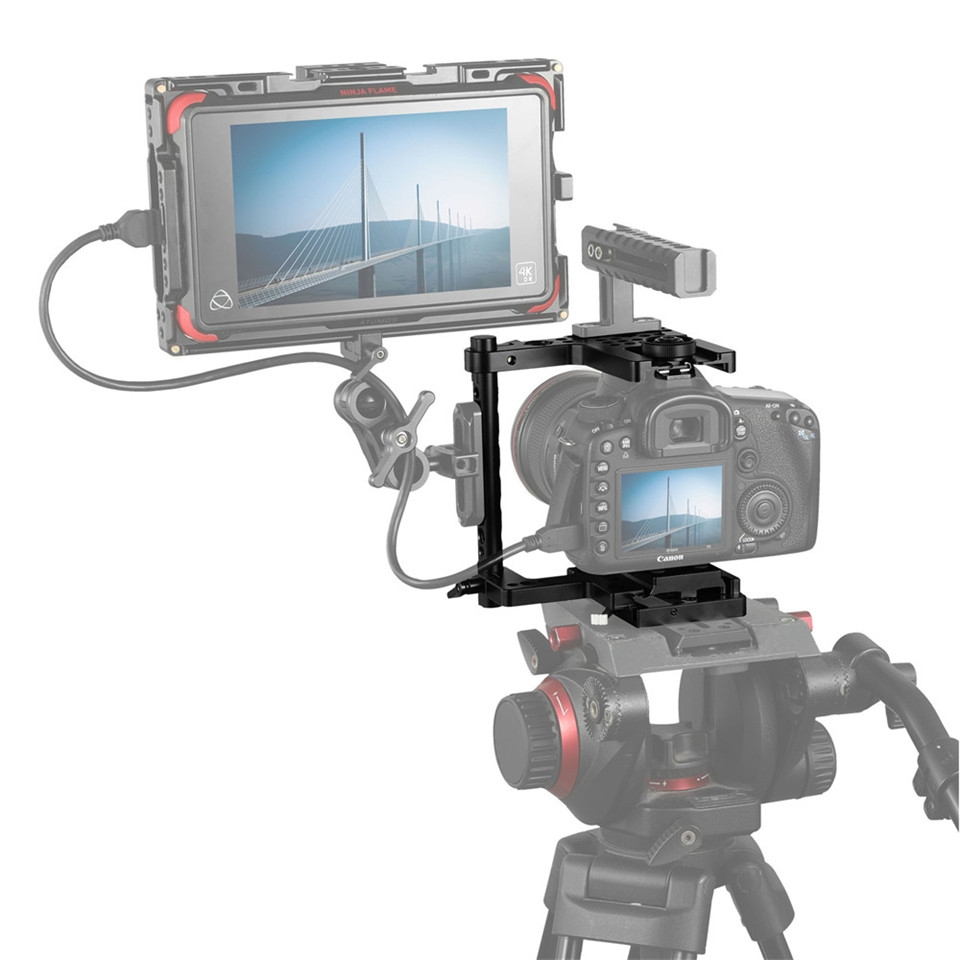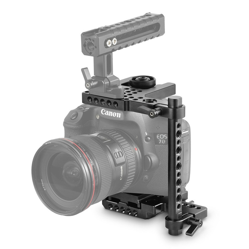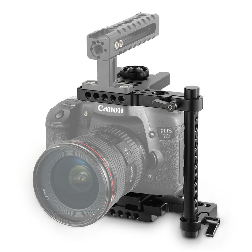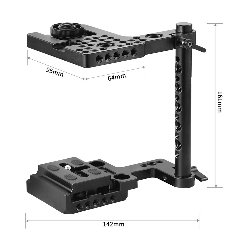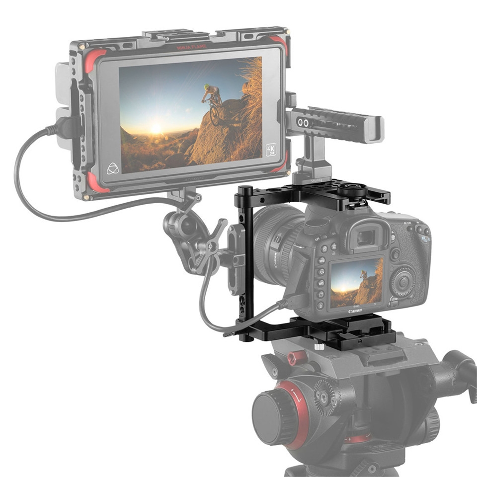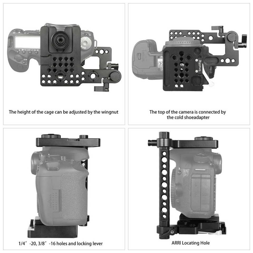 Smallrig QR VersaFrame Half Cage 2127 is a height adjustable cage designed for middle Canon and Nikon DSLR cameras like Canon 5D, 5DmkII, 5DmkIII, 5DmkIV, 6D, 6DmkII, 7DmkII, 60D, 70D, 80D, 700D, Nikon D750, D800, D810, D850, D80, D610, D500, DF, D7000. It features a built-in Manfrotto QR plate, which allows to quick attach and detach cameras in 3 seconds for diffrent shooting modes. With a hotshoe pinch on the top, cameras will be firmly fi*ed into one solid piece with the cage. It is equipped with many mounting points (1/4-20 holes, 3/8-16 holes , Arri locating holes, and a cold shoe) for accessories, like top handles, rod risers, magic arms, mic mounts and so on. You can attach wooden hand grip 1738 for more comfortable shooting.