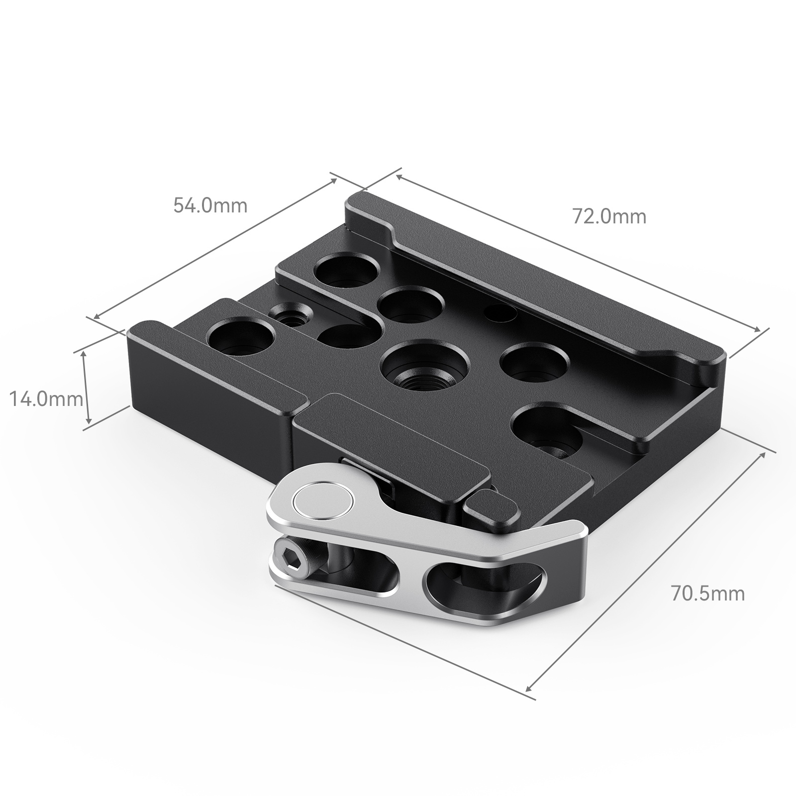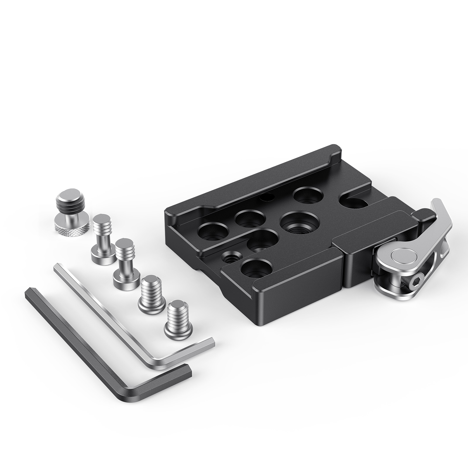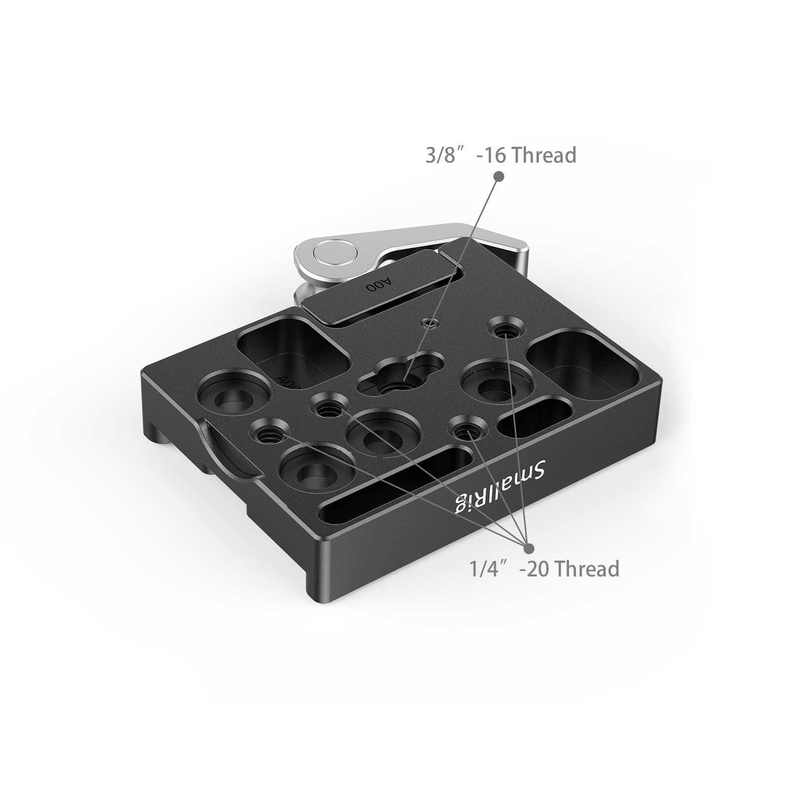 SmallRig Quick Release Clamp (Arca-type Compatible) 2143 is a lever-type base, tightness of which can be adjusted by stirring the tiny screw on the lever, so it is cross-compatible with most Arca type plates. It features multiple 1/4"-20, 3/8"-16 threaded holes and thorough mounting holes on the bottom, so you could mount it on tripods, jibs and other devices.