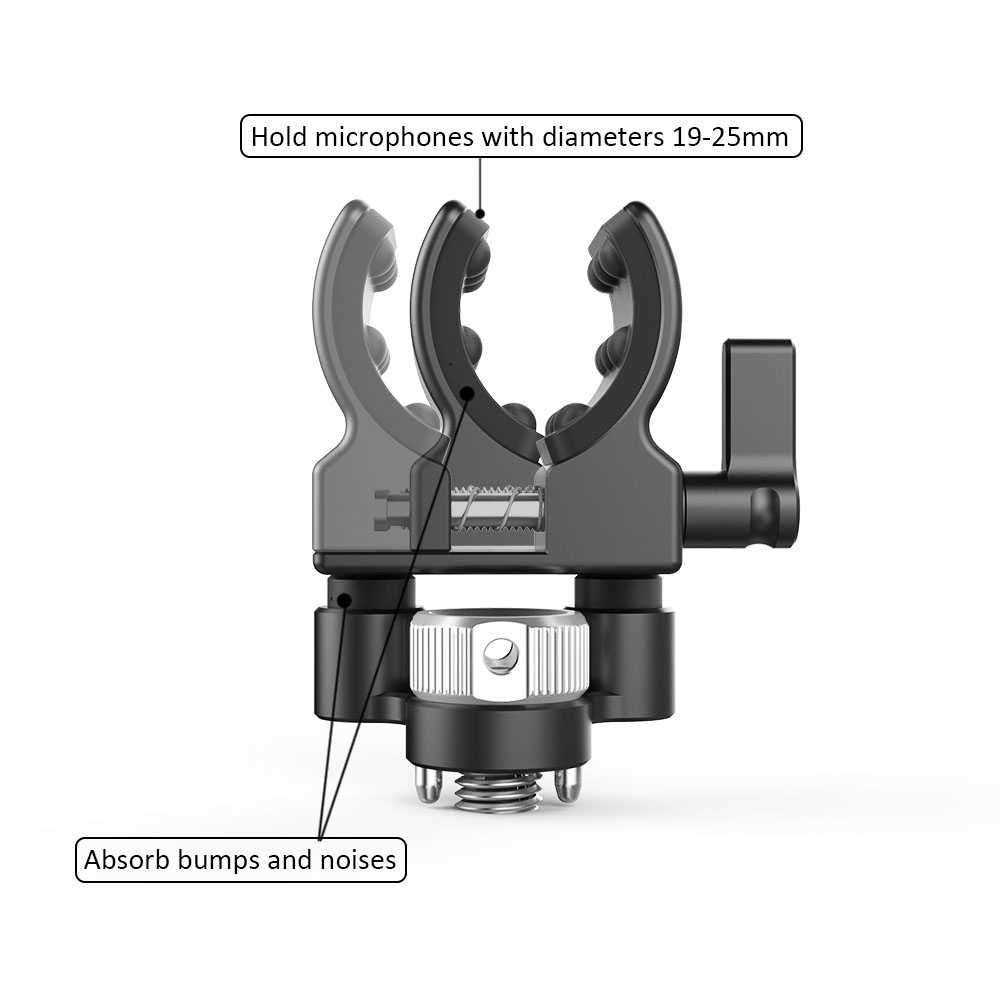 SmallRig Shotgun Microphone Holder (ARRI Locating Screw) BSM2368 holds microphones with diameter from 19mm to 25mm. By adjusting the knob, it can grip microphones of different sizes firmly. On the bottom of the holder is an ARRI locating screw, which can mount directly to the ARRI locating hole on cages or plates, or work with SmallRig Mini Plate with an Arri Locating Hole 2171. It comes with soft silicone within the microphone clamp and between the two parts, which absorb bumps and noises when you shoot run-and-gun.