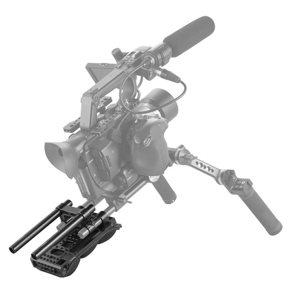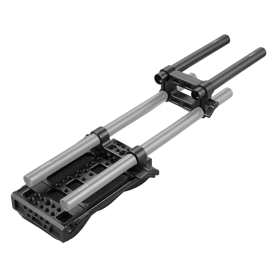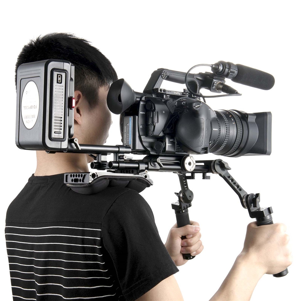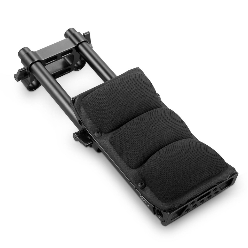 This shoulder rig kit is compatible with both big and small cameras. It bridges the camera and the shoulder pad 2077, and offers another 15mm rod rail system to attach external batteries and counterbalance weight at the back. On the shoulder pad there are multiple 1/4"-20, 3/8"-16 threaded holes and Arri locating holes for camera accessories. This kit extends application of 15mm rod rail system while optimizing run-and-gun shoulder balance.