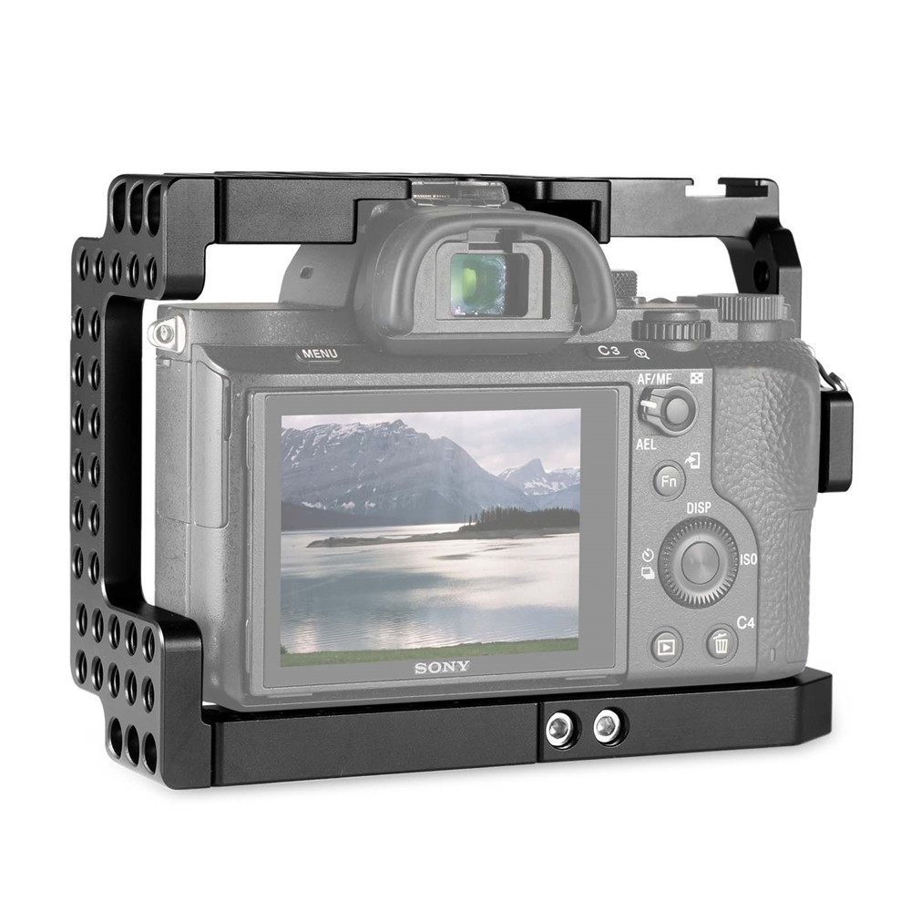 This camera cage is specially designed for Sony A7II/A7RII/A7SII ILCE-7M2 /ILCE-7RM2/ ILCE-7SM2.The cage designed is compact and lightweight.The delicate structure enables full access to the camera's buttons and controls.The top plate is equipped with arrays of mounting holes.It makes camera's hot shoe accessible, so that you can attach XLR-K1M for an external mic setup.The bracket at the right side with a shoe mount is removable. When it is removed, the remainder of the cage leaves the camera controls exposed for easier access.The front side of baseplate offers mounting holes for metabones adapter mount.Meanwhile, an anti-twist bar can be attached to the baseplate to prevent your camera from twisting.
