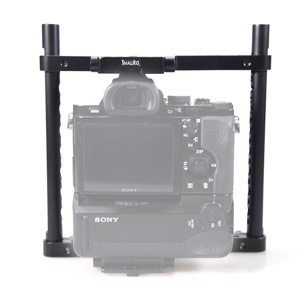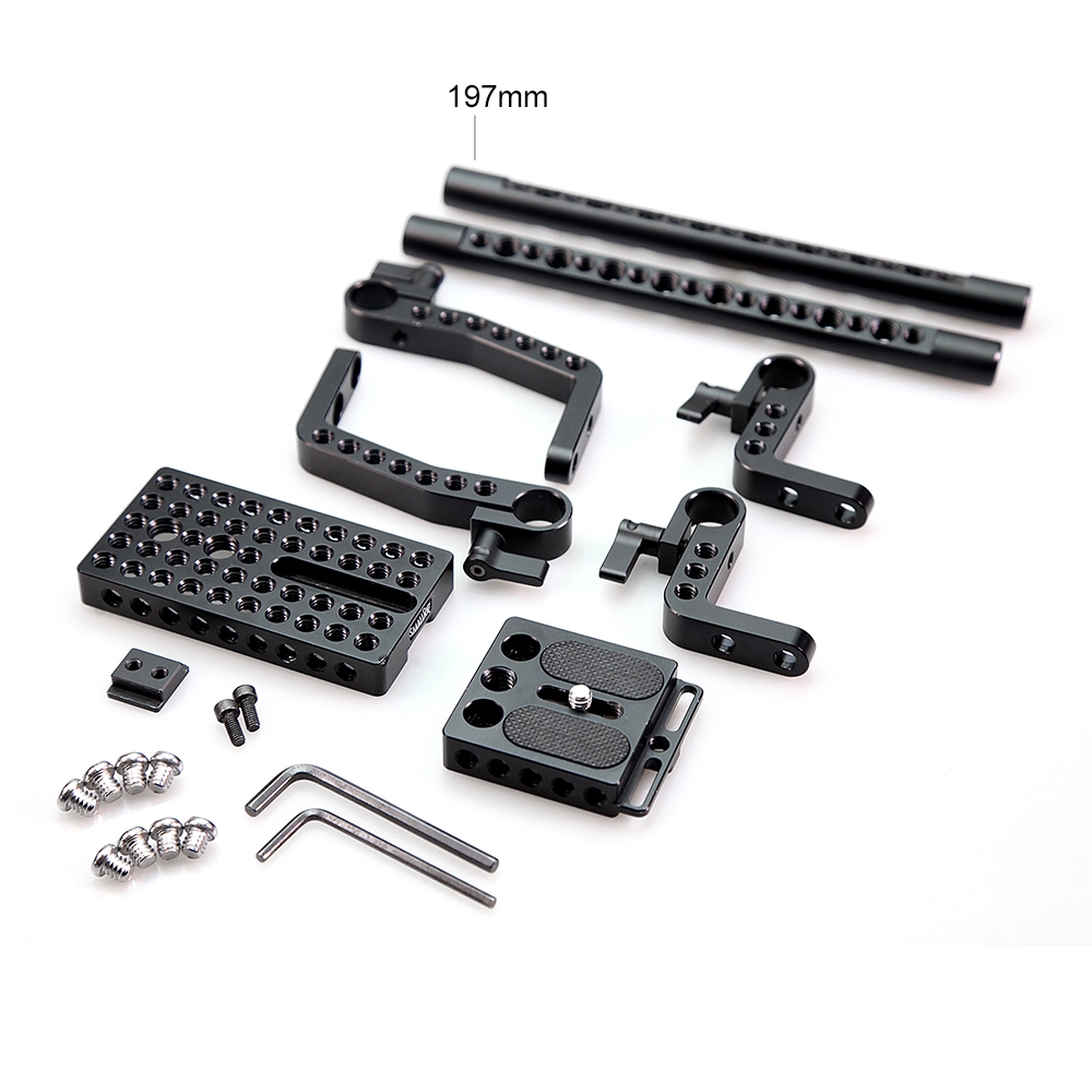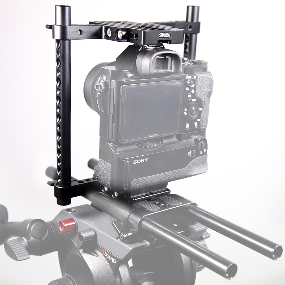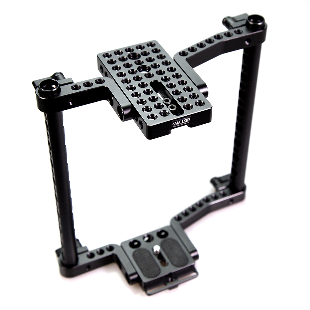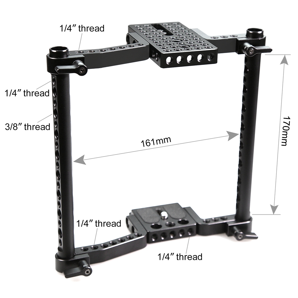 SMALLRIG VersaFrame Cage (Large) 1750 is a lightweight and compatible VersaFrame cage for large cameras and camcorders. The rods on both sides let you go handheld right away. The rods can be adjusted in height and position around the camera, and one side can even be completely removed if not needed. All camera connections, buttons, dials and the battery door remain fully accessible. Our custom hotshoe pinch connects your camera into one solid piece with the cage. Plenty of 1/4"-20 mounting threads allow for assembly of a full rig to your needs. The height of the cheese rods is 197mm and the width of this cage is 196mm.
